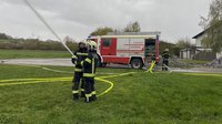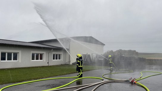 Parallel dazu begann unsere Mannschaft mit dem Aufbau eines C-Rohres zum Schutz des Bürogebäudes. Nachdem wir eine Zubringerleitung von der FF Affnang erhalten hatten, konnten wir gemeinsam mit den Kameraden der FF Weibern zwei weitere C-Rohre vornehmen.