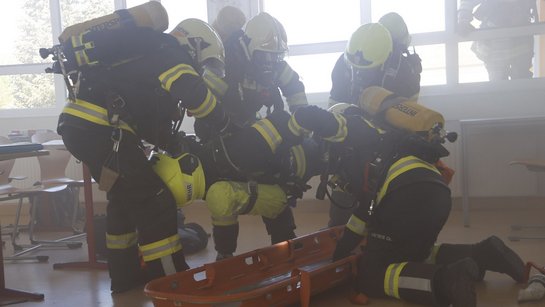 Beim Eintreffen am Übungsort waren bereits fast alle Schüler evakuiert. Eine Schulklasse war jedoch im Zeichensaal eingeschlossen – durch einen Brand im Vorraum war der Fluchtweg blockiert. Der Atemschutztrupp des TLF Hofkirchen begann unverzüglich mit der Brandbekämpfung und Menschen Rettung. Insgesamt 16 Schüler konnten über ein Fenster auf das Flachdach gerettet und dort von der Drehleiter Grieskirchen übernommen werden.