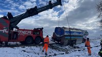 Nach dem Eintreffen des Bergeunternehmens unterstützten wir bei den Bergemaßnahmen. Mittels schwerem Gerät konnte der LKW schließlich kontrolliert und ohne weitere Schäden aus dem Graben gezogen werden.